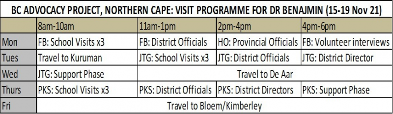 The visit will cover three districts (Frances Baard, John Taolo Gaestewe, Pixely Ka Seme) as well as a meeting with Provincial Officials in Kimberley.